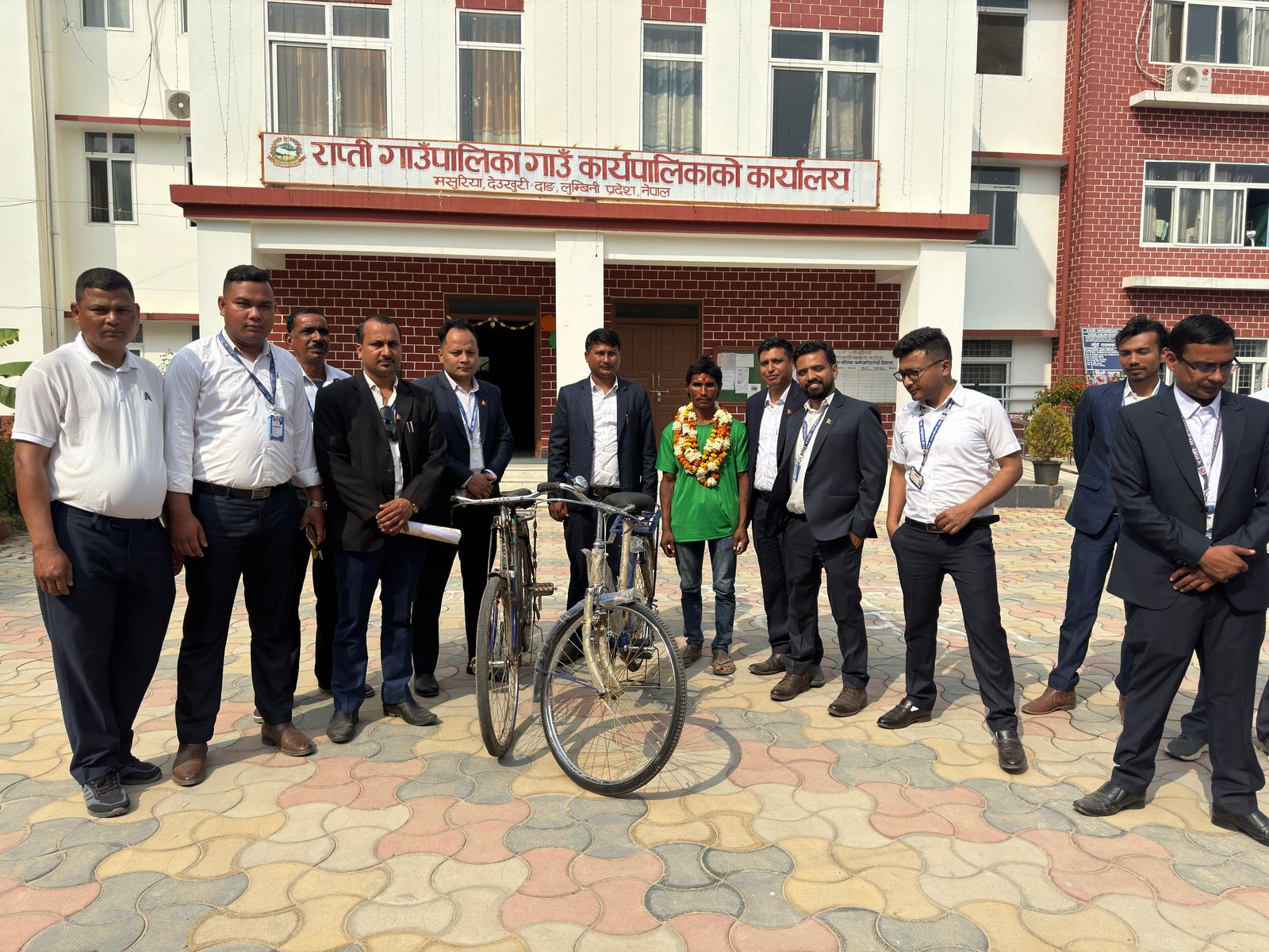 देउखुरी – दाङको राप्ती गाउँपालिकाले आफ्नो नवौं स्थापना दिवसको अवसरमा बुधबार साइकल दौड प्रतियोगिता आयोजना गर्यो । प्रतियोगितामा वडा नम्बर २ का वीर बहादुर कुमालले तृतीय स्थान हासिल गरे।