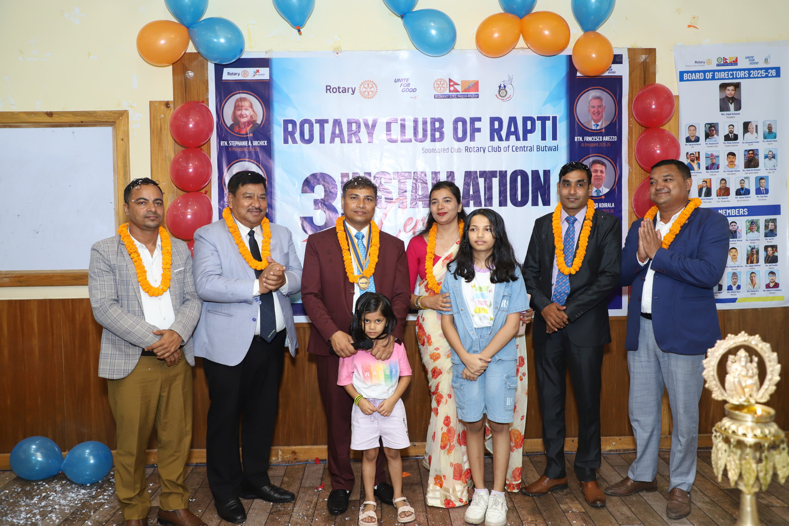 देउखुरी । रोटरी क्लब अफ राप्तीको तेस्रो पदस्थापन कार्यक्रम भालुवाङको होटल पौवामा सम्पन्न भएको छ । वर्ष २०२५/०२६ का अध्यक्ष गोपाल आचार्यले सपथ ग्रहण गदैं आफ्नो कार्यकाल सरु गरेका छन् ।