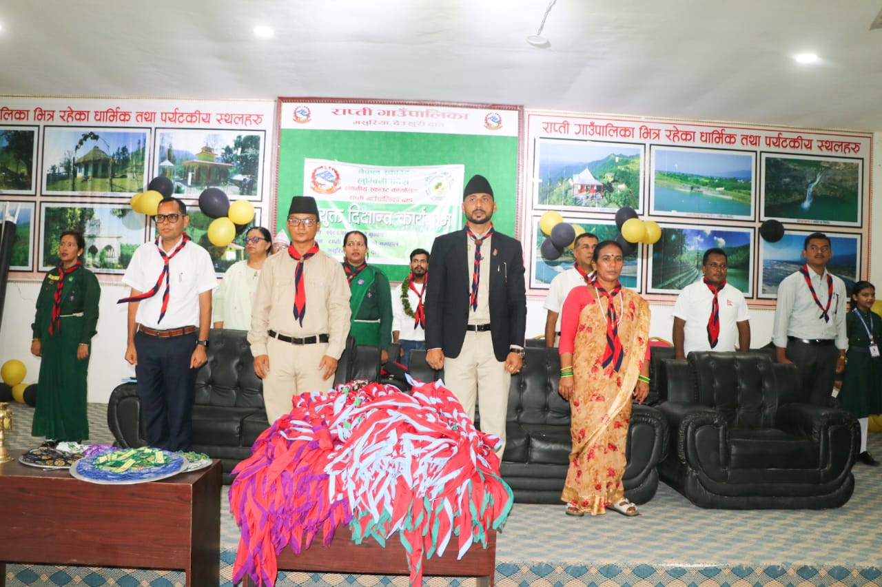 देउखुरी । दाङको राप्ती गाउँपालिकामा स्काउट विद्यार्थीहरूको संयुक्त दीक्षान्त कार्यक्रम सम्पन्न भएको छ। स्थानीय स्काउट राप्तीको आयोजनामा बुधबार राप्ती गाउँपालिकाको सभाहल मसुरियामा उक्त कार्यक्रम सम्पन्न भएको हो।