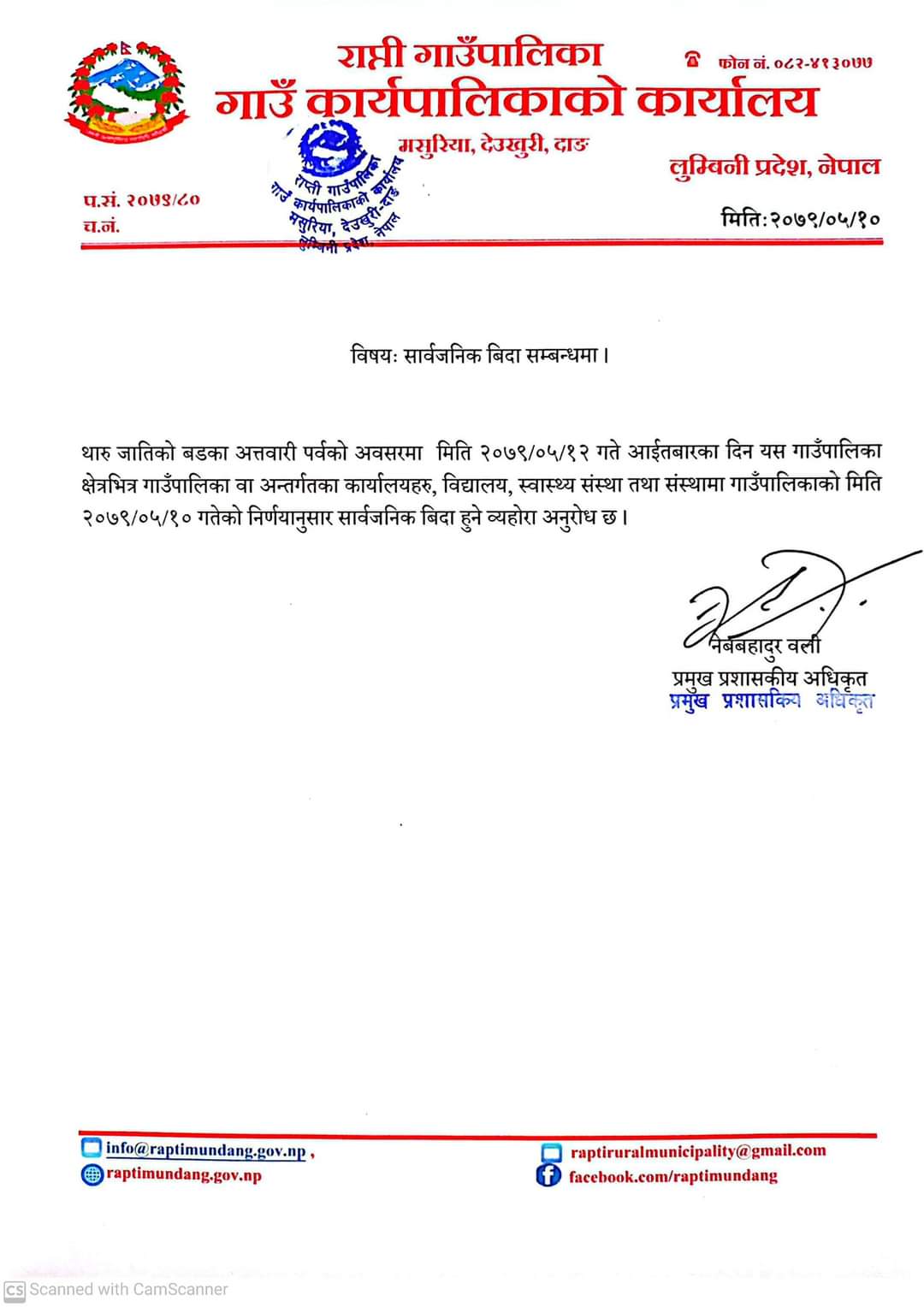 भाद्र १२ गते आइतबार थारु जातिको बड्का अत्तवारी पर्वको अवसर पारेर गाउँपालिकाले सार्वजनिक बिदा दिने भएको हो ।