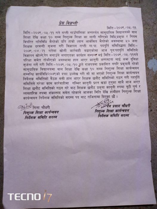 ‘हाल आएर शिक्षक छनौट समितिको गठन गरी पदपुर्ति समितिले गरेका काम कार्यवाहीमा गम्भिर कानुनी प्रश्न खडा हुनुको साथै आज आएर शिक्षा छनौट समिति गठन गरे बाट शिक्षक छनौट प्रकृया कानुनी रुपमा त्रुटी पूर्ण र व्यवाहारिक रुपमा शंकास्पद छ’ बिज्ञप्तिमा भनिएको छ ‘त्यसैले निःशुल्क शिक्षा कार्यन्वयन निर्देशक समितिको सदस्यबाट राजिनामा दिएका छौं ।’