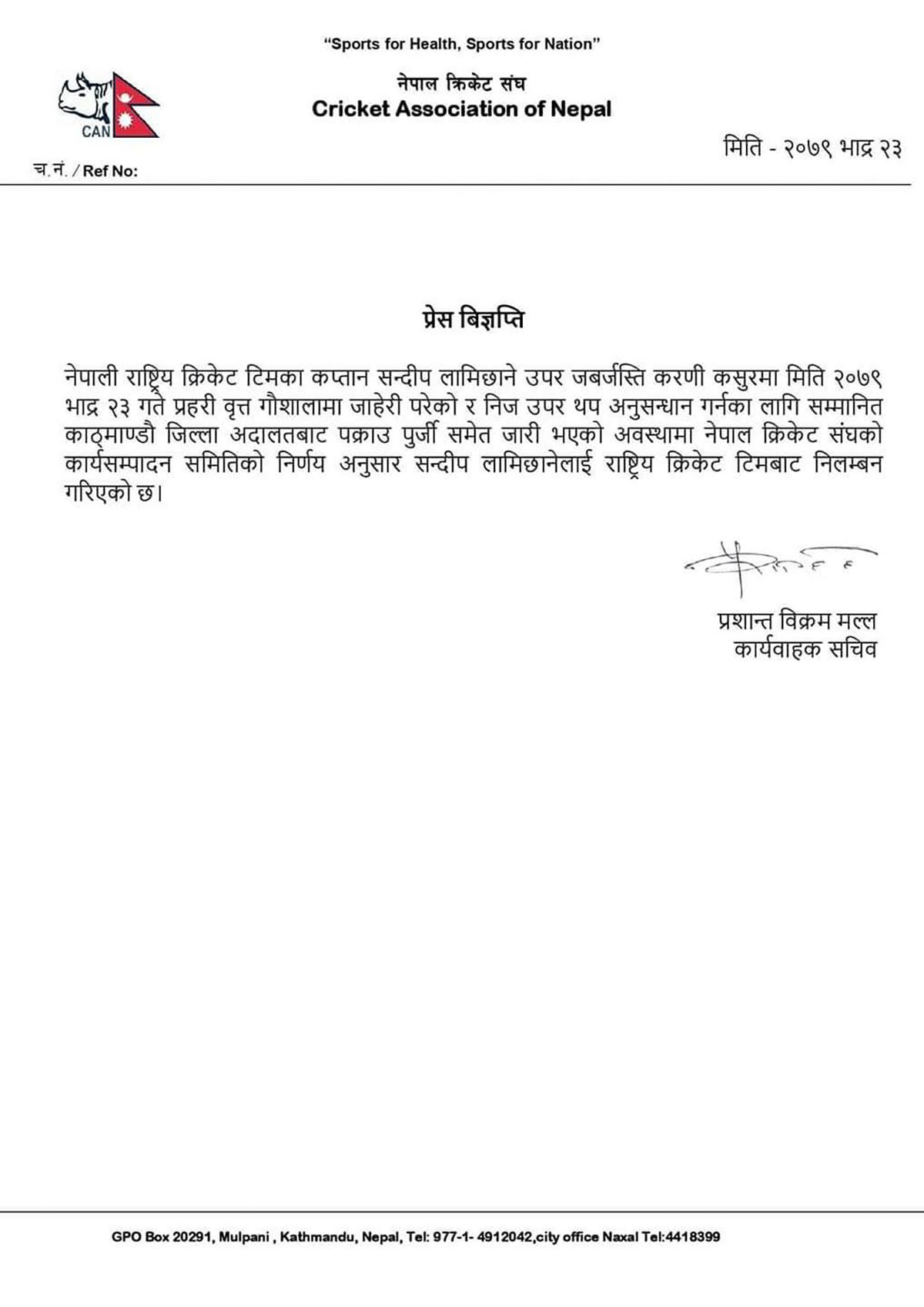 क्यानका कार्यवाहक सचिव प्रशान्त विक्रम मल्लले बिहीबार साँझ एक प्रेस विज्ञप्ति जारी गर्दै कप्तान लामिछानेविरुद्ध जबर्जस्ती करणी कसुरको गरेको आरोपमा अनुसन्धानका लागि प्रहरीमा उजुरी परेको जनाउँदै संघको कार्य सम्पादन समितिको निर्णय अनुसार राष्ट्रिय क्रिकेट टिमबाट निलम्बन गरिएको जनाएका छन्।