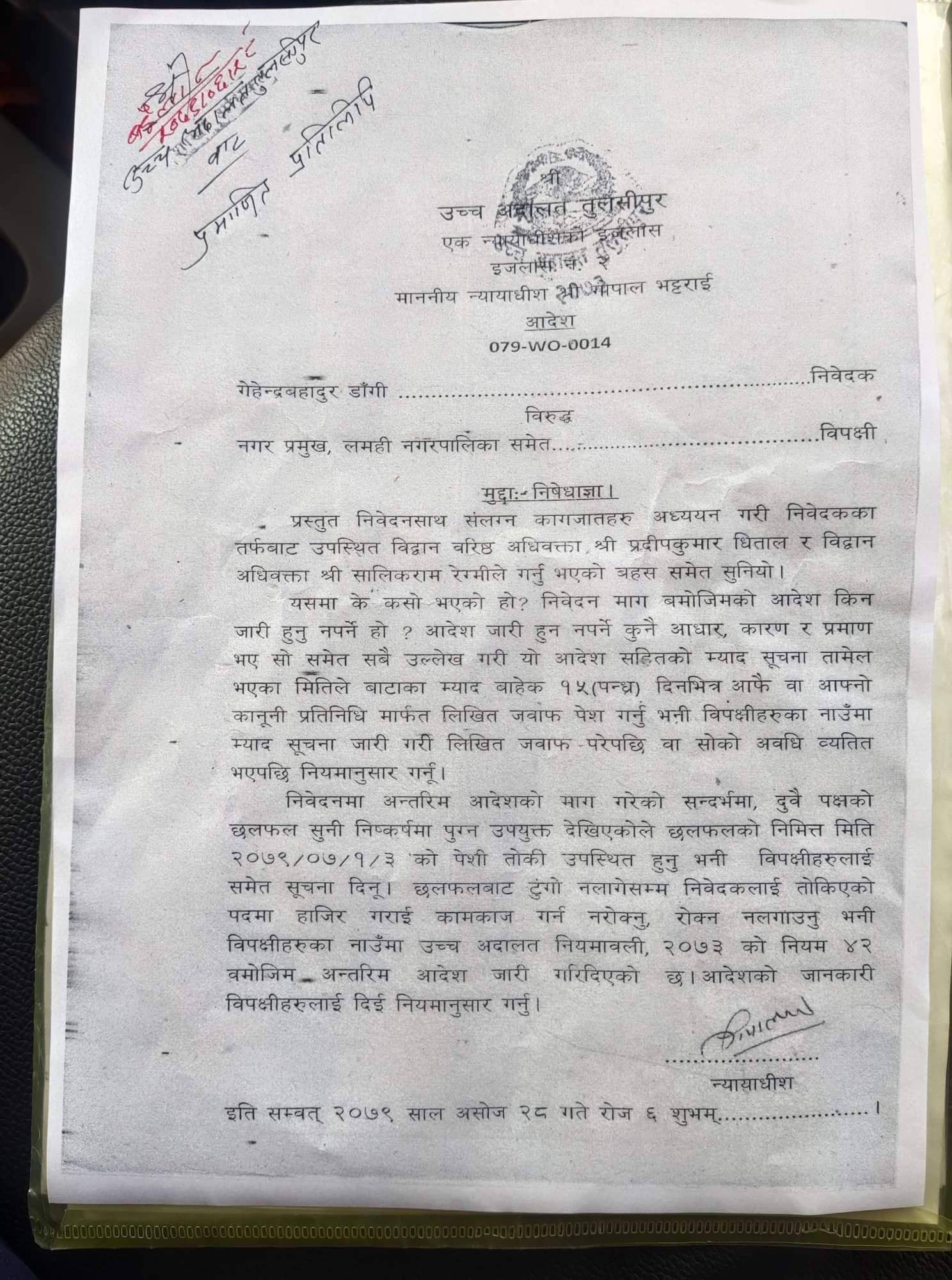 दाङ– उच्च अदालत तुलसीपुरले लमही नगरपालिकाका प्रमुख प्रशासकीय अधिकृत गेहेन्द्र बहादुर डाँगीलाई हाजिर गर्न दिनु भनेर लमही नगरपालिकाको नाममा अन्तरिम आदेश जारि गरेको छ। अदालतले २८ गते अन्तरिम आदेश जारि गरेको थियो भने आज पुनः उक्त आदेशलाई निरन्तरता दिएको छ ।