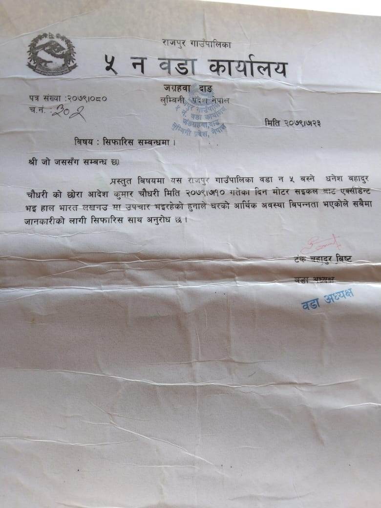 राजपुर गाउँपालिका–५ निवासी धनेश चौधरीका छोरा आदेशकुमार चौधरीको आर्थिक अभावका कारण उपचारमा समस्या परेको हो ।
