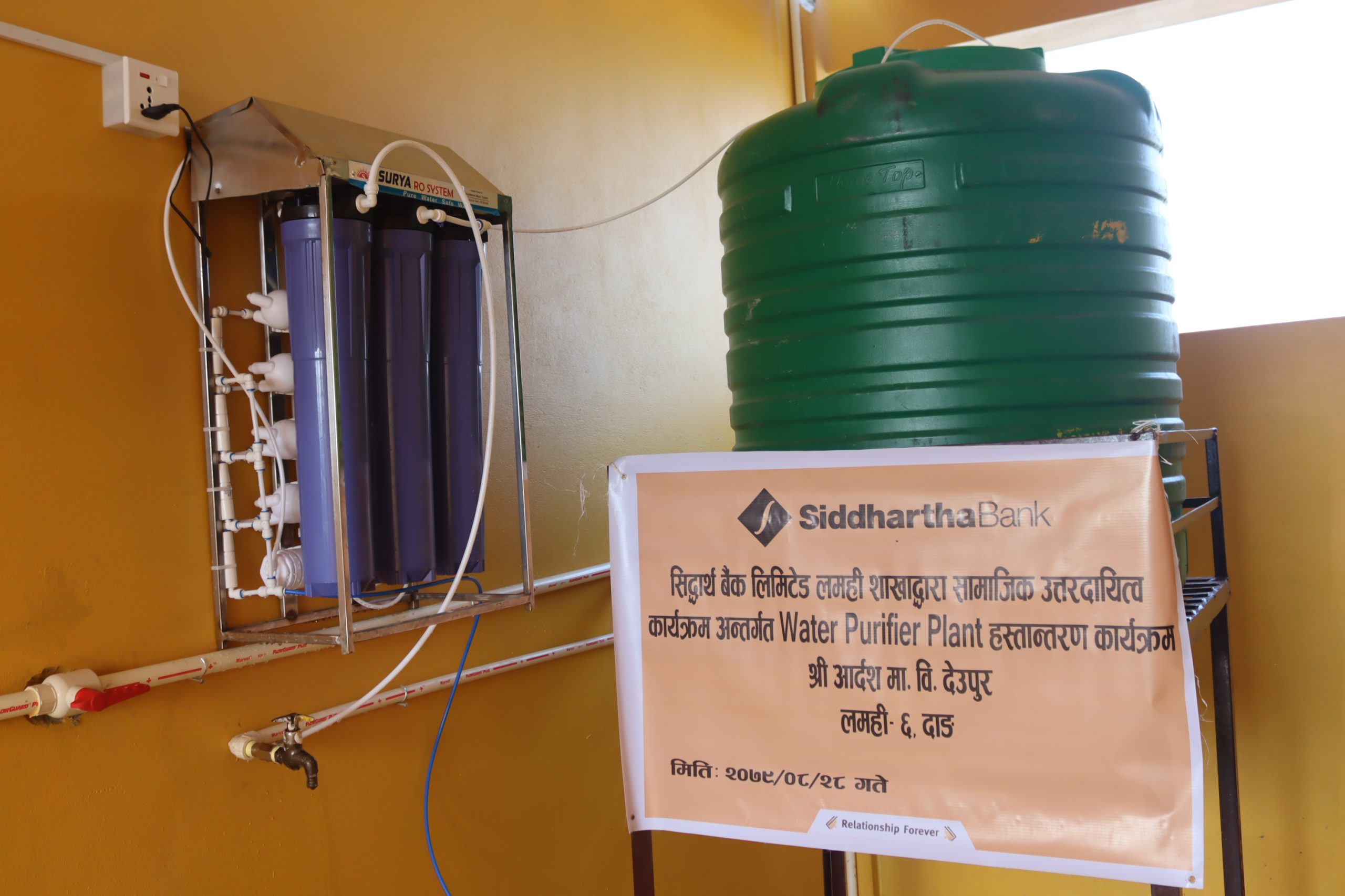 सिद्धार्थ बैंक लिमिटेड लमही शाखाले आदर्श नमुना माध्यमिक विद्यालय देउपुरमा आधुनिक प्रविधि सहितको फिल्टर जडान गरेको बैंकका शाखा प्रमुख सुवाश शाहीले जानकारी दिनुभयो ।‘बैंकले समाजबाट लिने मात्रै होइन, दिने पनि हो भन्ने मान्यताको आधारमा सामाजिक उत्तरदायीत्व अन्तरगत कार्यक्रम गरेका हौं’उहाँले भन्नुभयो,‘शुद्ध पानीको अभाव थियो । अव फिल्टर जडान भयो । विद्यार्थी र शिक्षकलाई शुद्धपानीको लागी कुनै दुःख हुने भएन् ।’