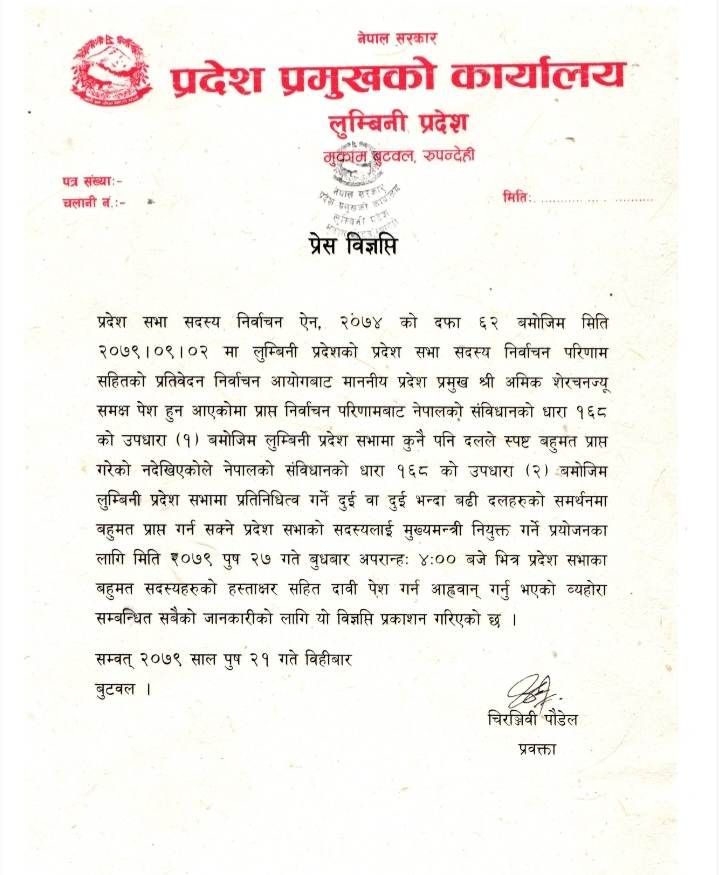 पुस २७ गते बुधवार दिउँसा ४ बजे भित्र प्रदेशसभाका बहुमत सदस्यको हस्ताक्षरसहित दावी पेश गर्न आह्ववान् गरिएको हो ।