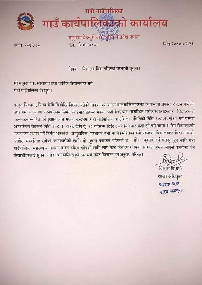 केही दिनदेखिको निरन्तर बढिरहेको गर्मीका कारण बालबालिकाहरुको स्वास्थ्यमा समस्या देखिन थालेपछि राप्तीका विद्यालय ३ दिनका लागि विदा गरिएको हो ।
