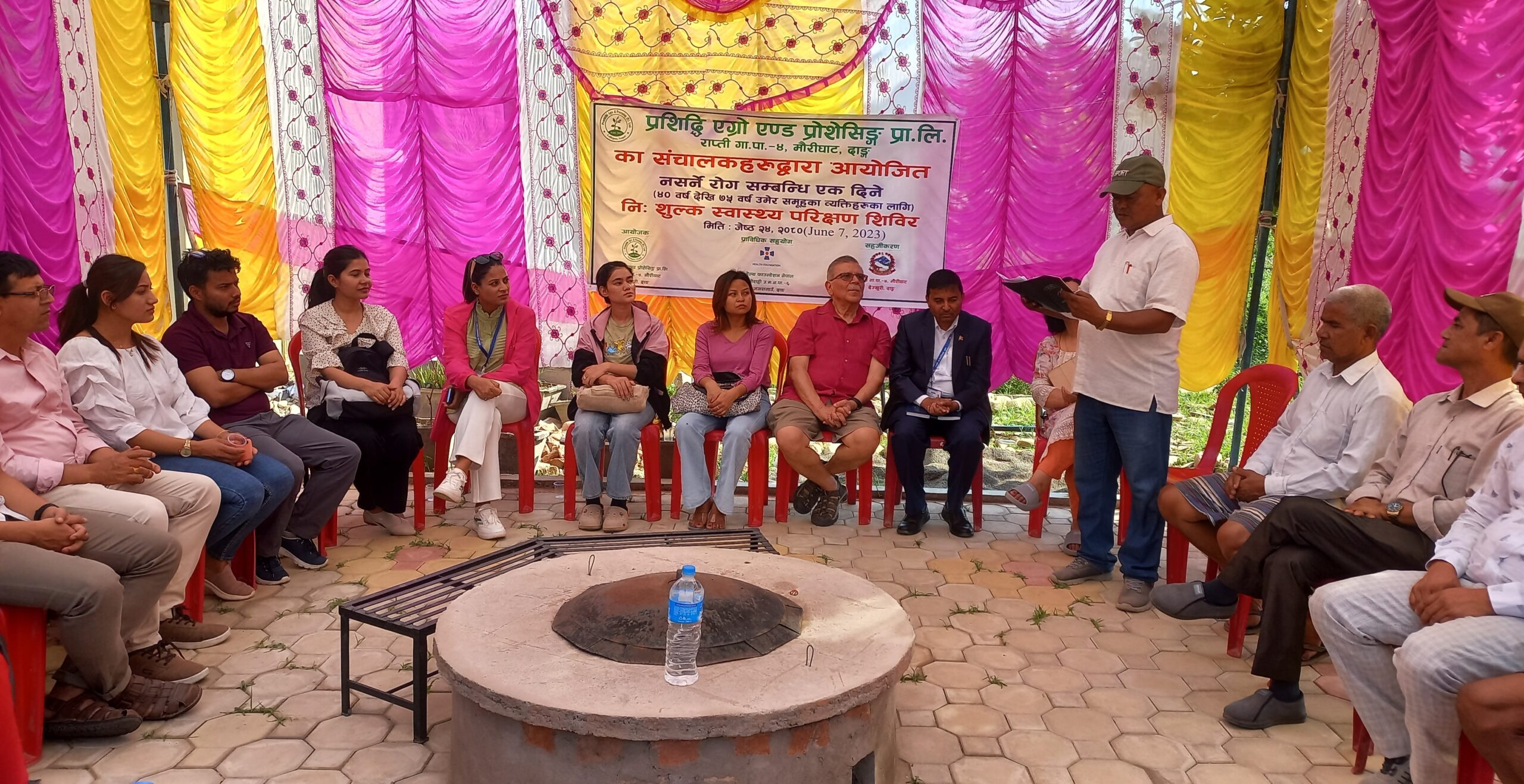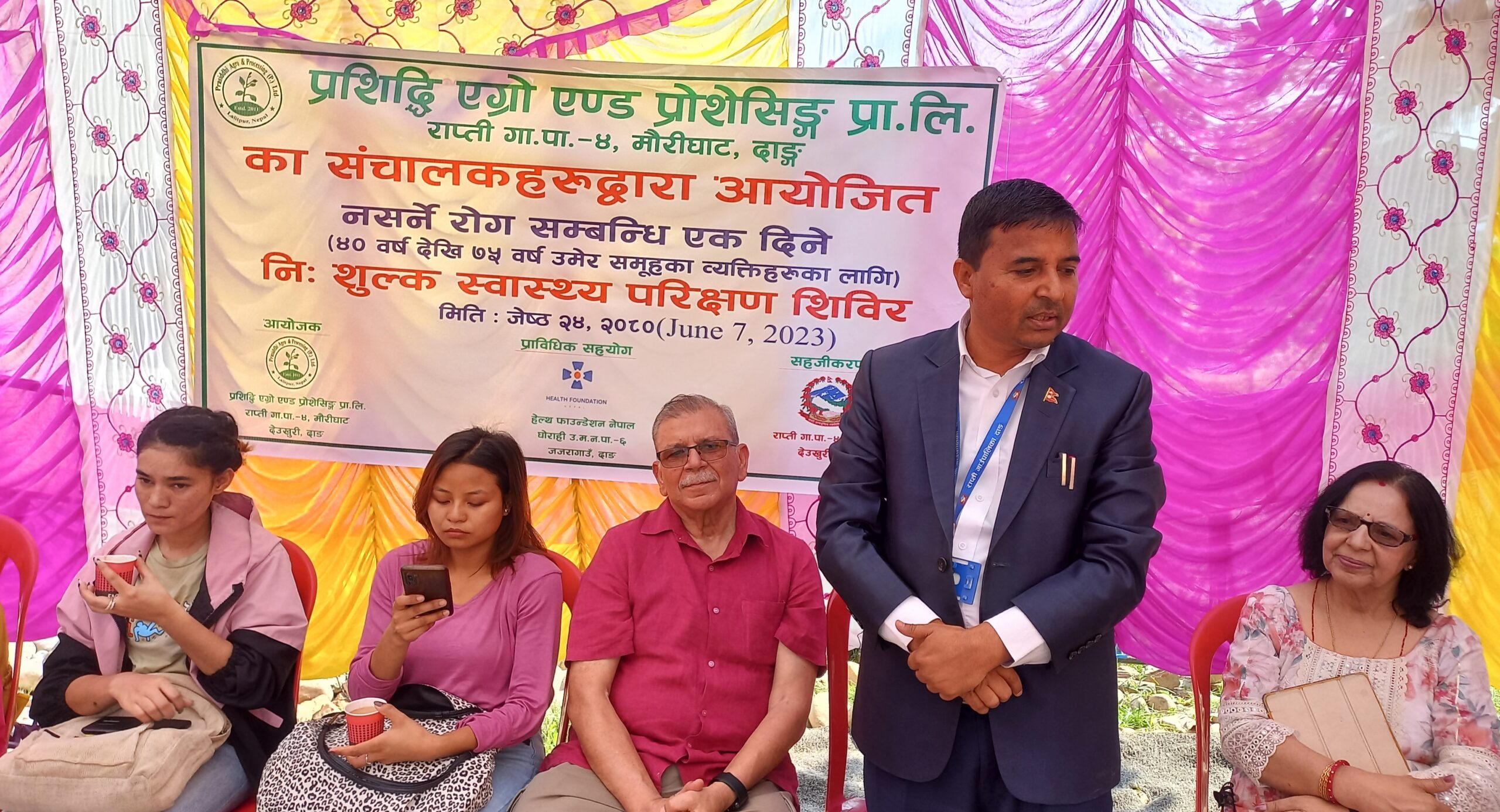 प्रशिद्धि एग्रो एण्ड प्रोशेसिङ प्रा.ली ले राप्ती गाउँपालिका वडा नं. ४ स्थित आफ्नै फर्ममा नसर्ने रोग सम्बन्धि एक दिने निःशुल्क स्वास्थ्य शिविरमा आयोजना गरेको थियो । उक्त शिविरमा ४० वर्षदेखि ७५ वर्ष उमेर समुहका १ सय ४० जनाले स्वास्थ्य उपचार गर्ने अवसर पाएका प्रशिद्धि एग्रो एण्ड प्रोशेसिङ प्रा.ली का सञ्चालक प्रकाश मणी घिमिरेले जानकारी दिए ।