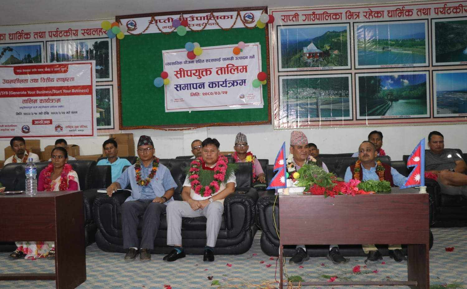 राप्ती गाउँपालिकाका अध्यक्ष प्रकाश बिष्टको अध्यक्षता एवम् लुम्बिनी प्रदेश सरकारका अर्थमन्त्री धनबहादुर मास्कीको प्रमुख आतिथ्यतामा तालिम समापन गरिएको हो ।