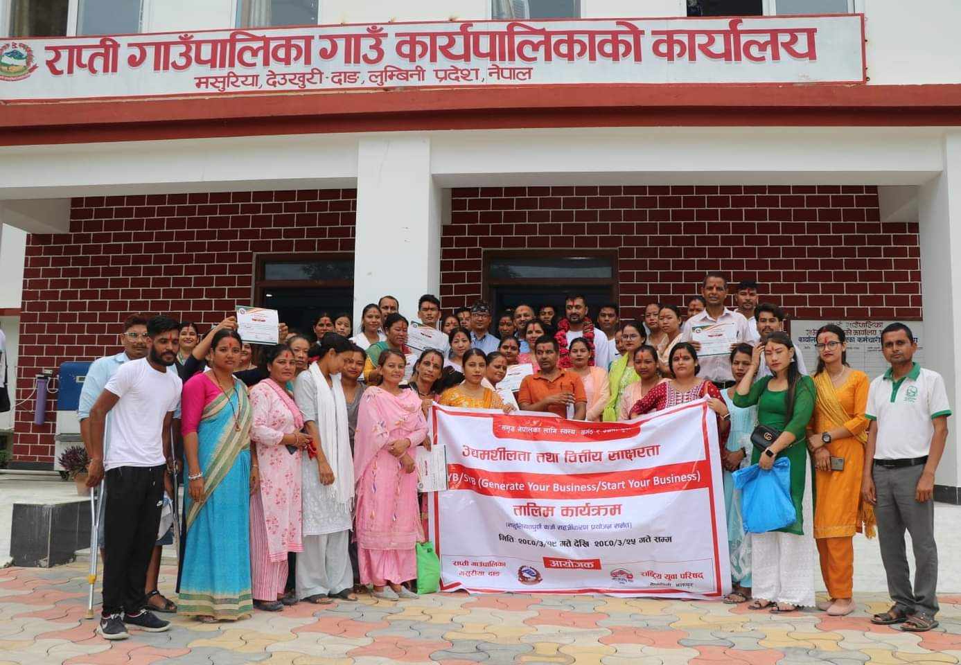 समृद्ध नेपालका लागि स्वच्छ, कर्मठ र उद्यमी युवा भन्ने मुल नाराका साथ राप्ती गाउँपालिका दाङ र राष्ट्रिय युवा परिषद् सानोठिमी भक्तपुरको संयुक्त आयोजनामा सञ्चालित तालिमका सहभागीहरु लाई हार्पिक, कुलीन, फिनाईल, ह्यान्ड वास लगायतका सामाग्रीहरु उत्पादन र बजारीकरण सम्बन्धी सिकाइएको थियो ।