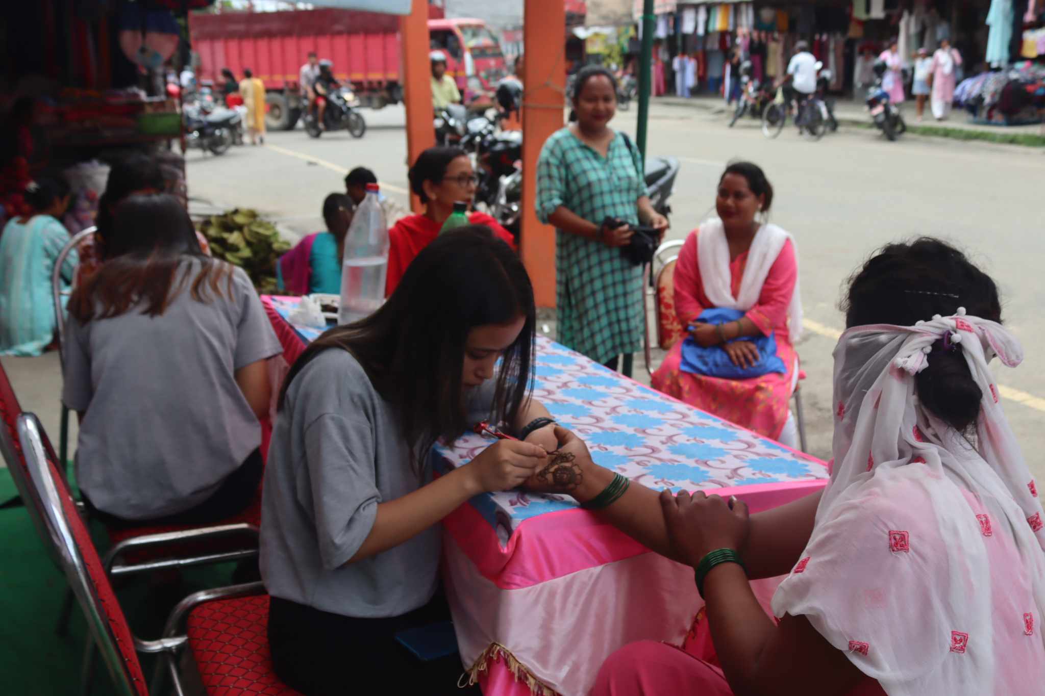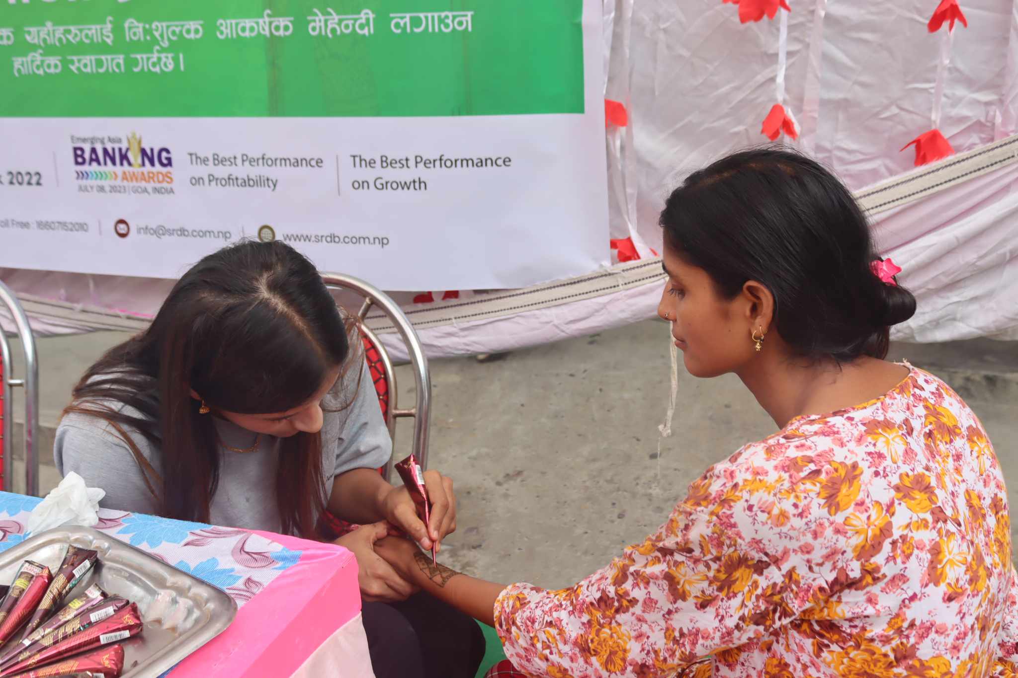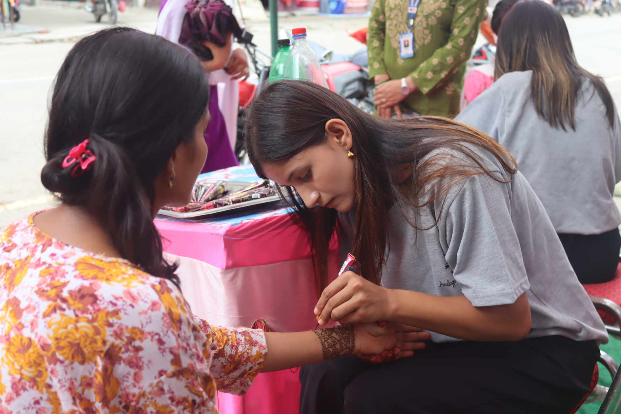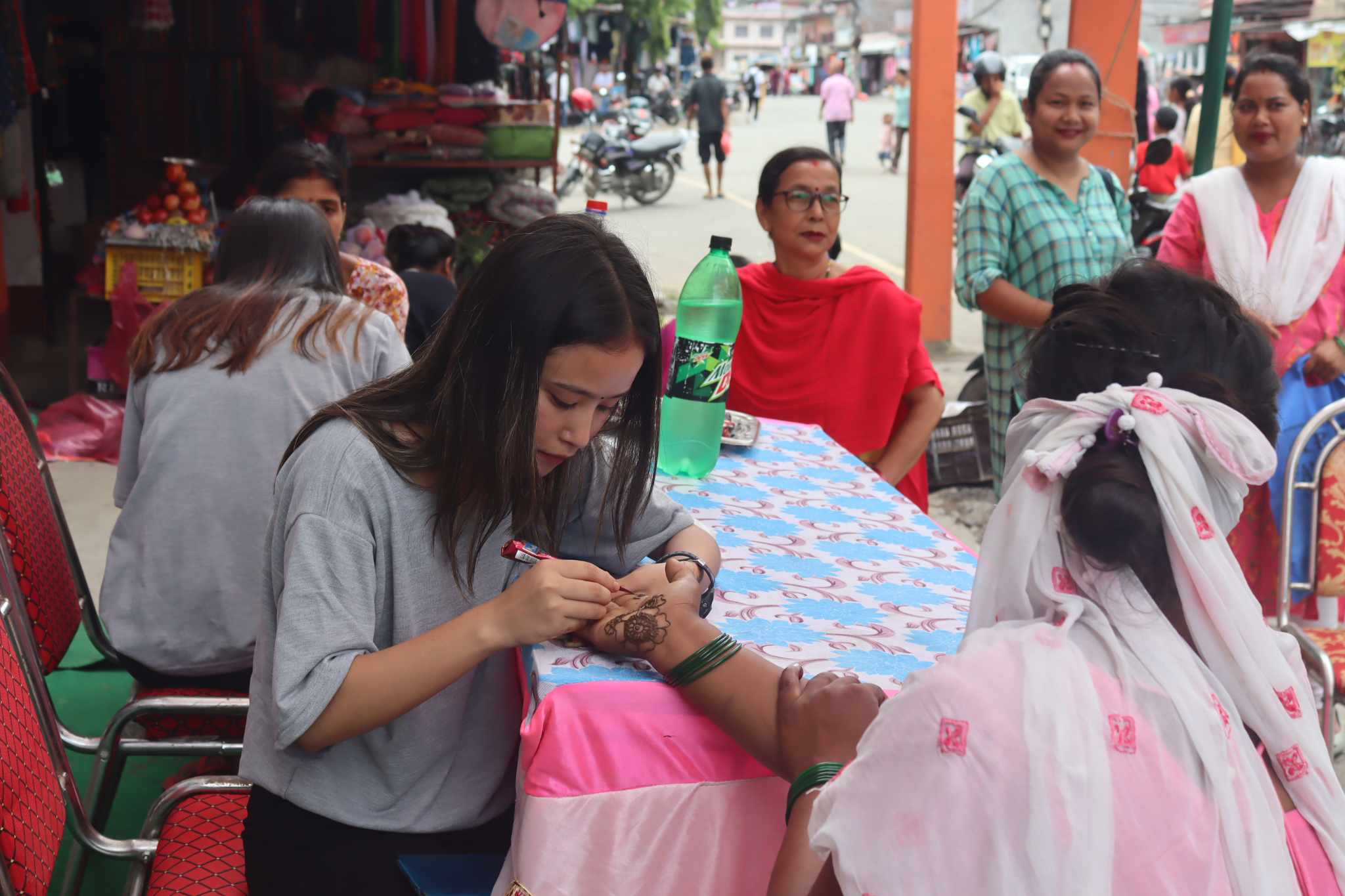 नि:शुल्क मेहेन्दी लगाउने स्टल राखिएपछि यहाँका नारी दिदीबहिनीहरू लाइनमा बसेर मेहेन्दी लगाउन उत्साहित भएका छन्।