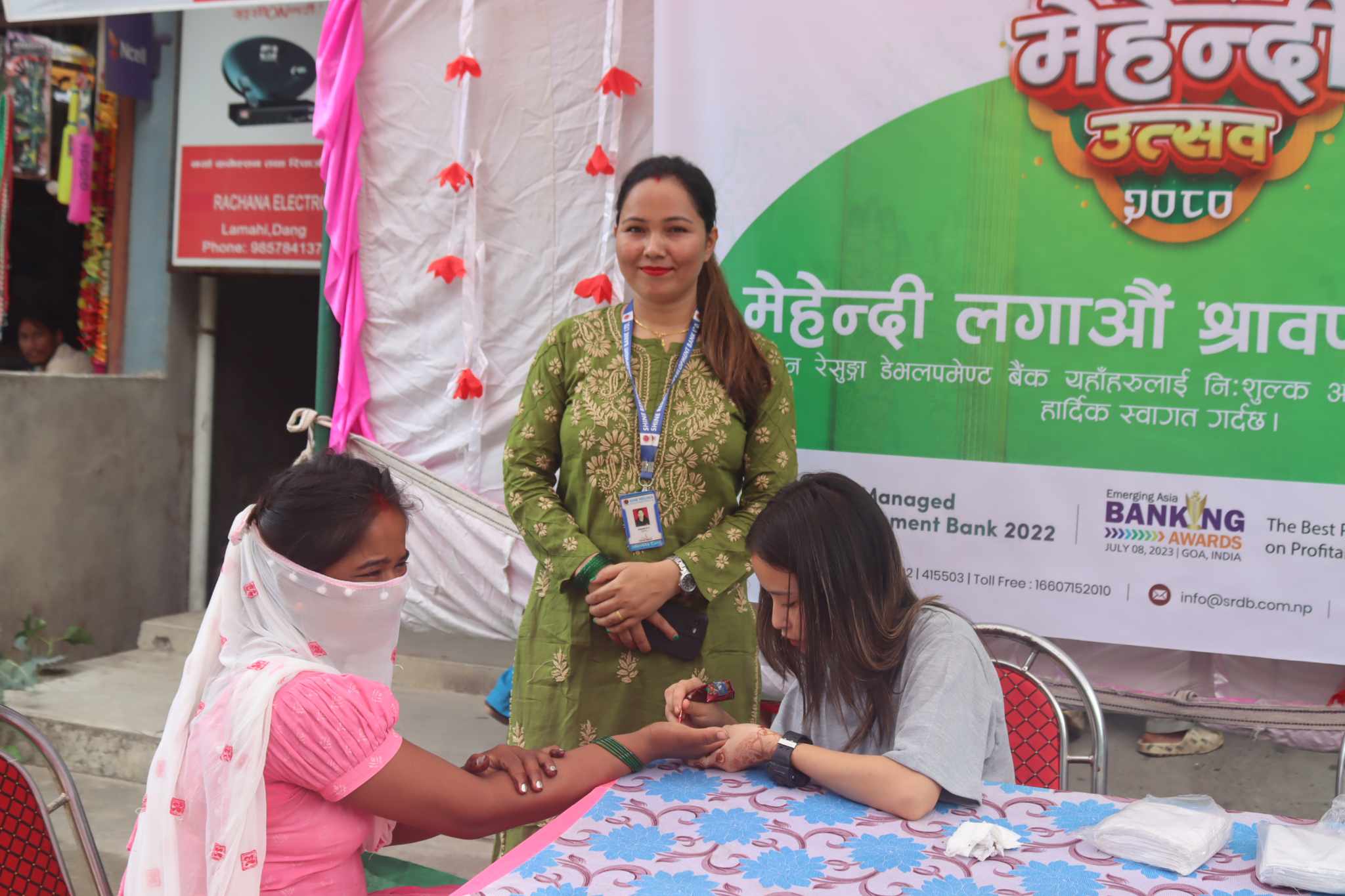 दाङ – शाइन रेसुङ्गा डेभलपमेन्ट बैंक लिमिटेड लमही शाखाले सार्वजनिक स्थलमा नि:शुल्क मेहेन्दी लगाउने स्टल राखेकाे छ।