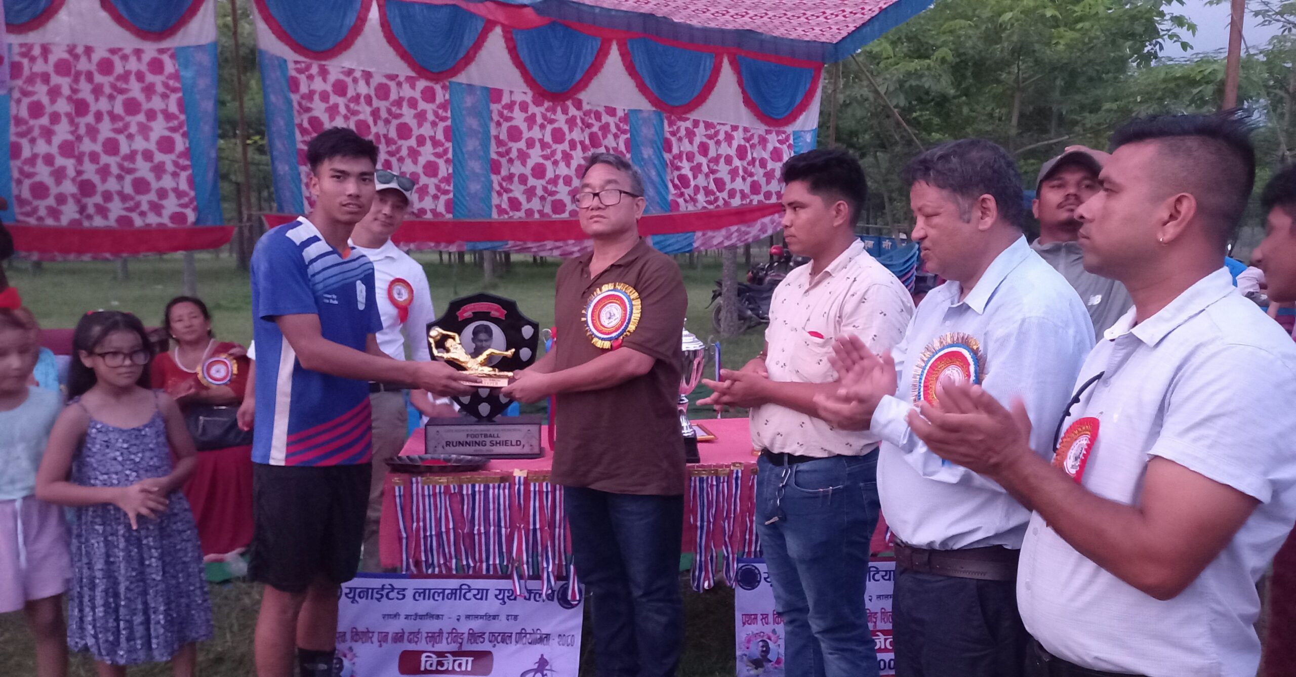 देउखुरी । प्रथम स्व. किशोर पुन(बने दाई) स्मृती रनिङ शिल्ड फुटबलमा अयोजक समुह युनाइटेड लालमटिया युथ क्लवले शिल्ड हात पारेको छ ।