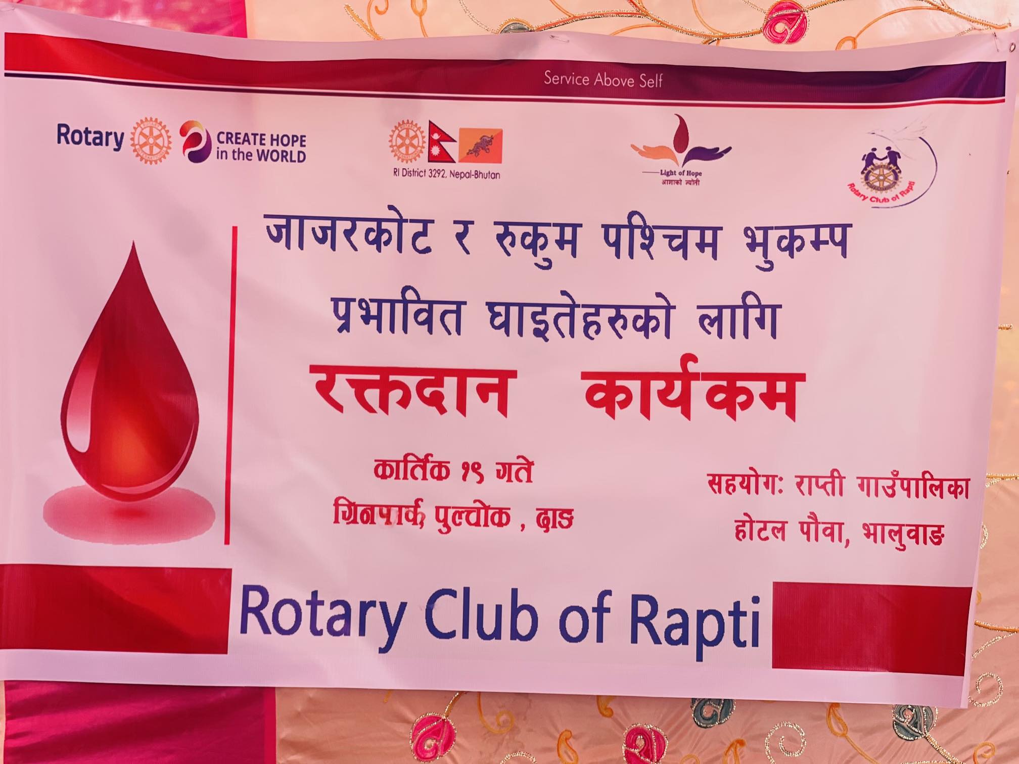 रोटरी क्लव अफ राप्तीको आयोजनामा भएको उक्त रक्तदान कार्यक्रममा राप्ती गाउँपालिका र होटल पौवाको विशेष सहयोगमा रक्त सञ्चार सेवा केन्द्र लमहीका प्रमुख मनिषा चन्द, प्राविधिकहरू सिमा वलीेले सेवा दिएका थिए ।