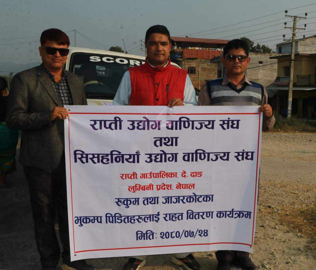 संघका सदस्य तथा राप्ती गाउँपालिकाका विभिन्न स्थानका व्यापारीबाट संकलन गरिएको बल्याङ्केट, म्याट लगाउने लत्ताकपडा, त्रिपाल गरी करिव २ लाख ३० हजार बराबरको राहत बोकेर जाजरकोट प्रस्थान गरेको हो ।