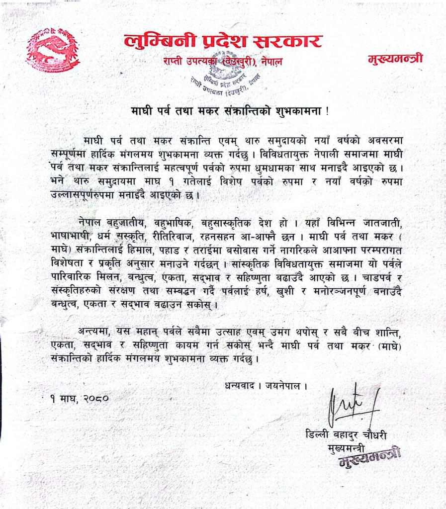 माघी थारु जातिको नयाँ बर्ष समेत भएकाले संस्कृतिहरुको संरक्षण तथा सम्बद्धन गर्दै हर्ष, खुशीका साथ मनाउदै बन्धुत्व, एकता र सद्भाव कायम गर्न आग्रह गरेक छ्न । पर्वले शान्ति, एकता, सद्भाव र सहिष्णुता कायम गर्न सकोस शुभकामनामा भनिएको छ ।
