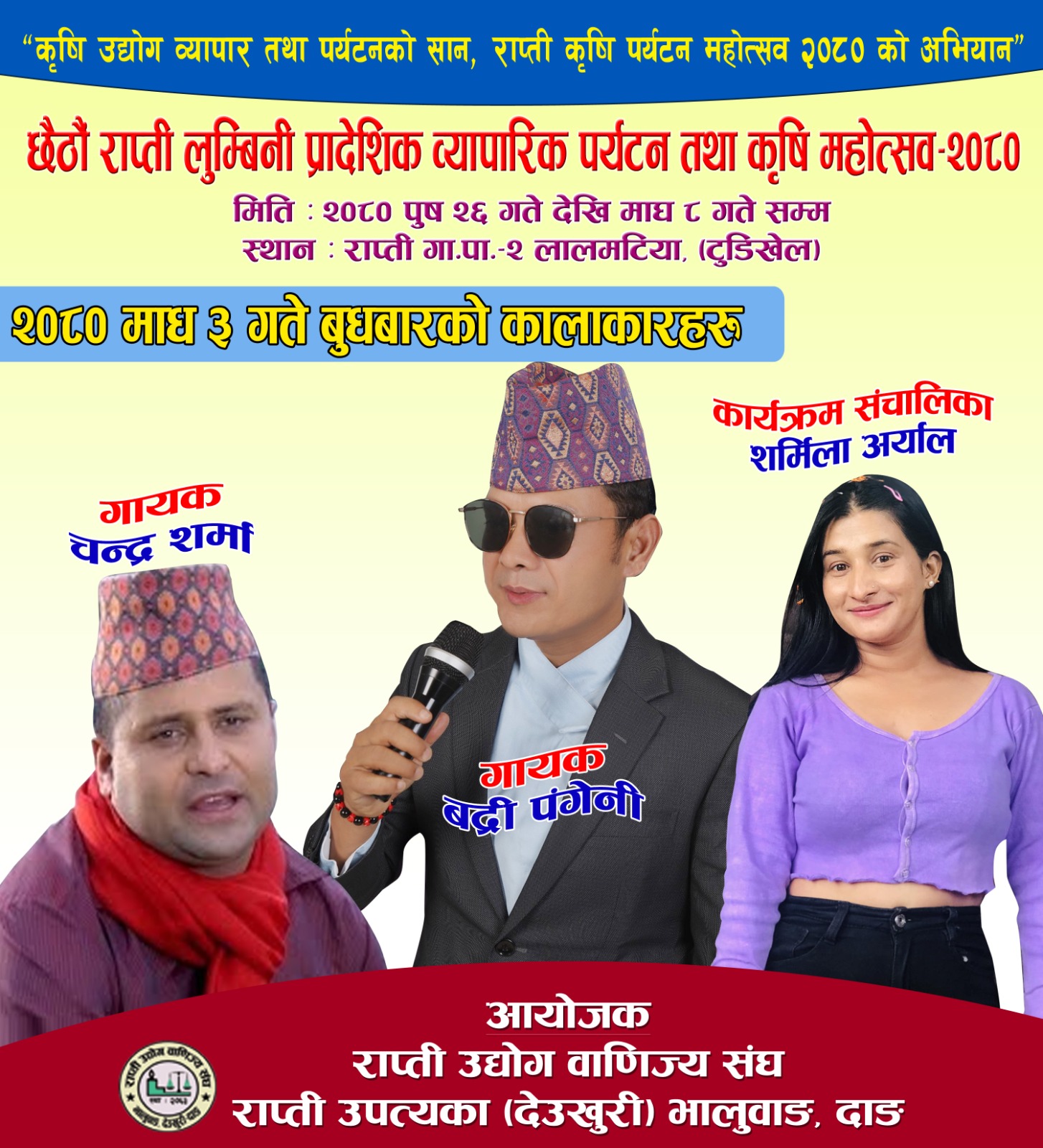 पुष २६ गतेदेखि माघ ८ गतेसम्म जारी महोत्सव २०८० राप्ती गाउँपालिकाको वडा नं. २ लालमटियामा रहेको टुडिखेलमा संचालन भइरहेको छ ।