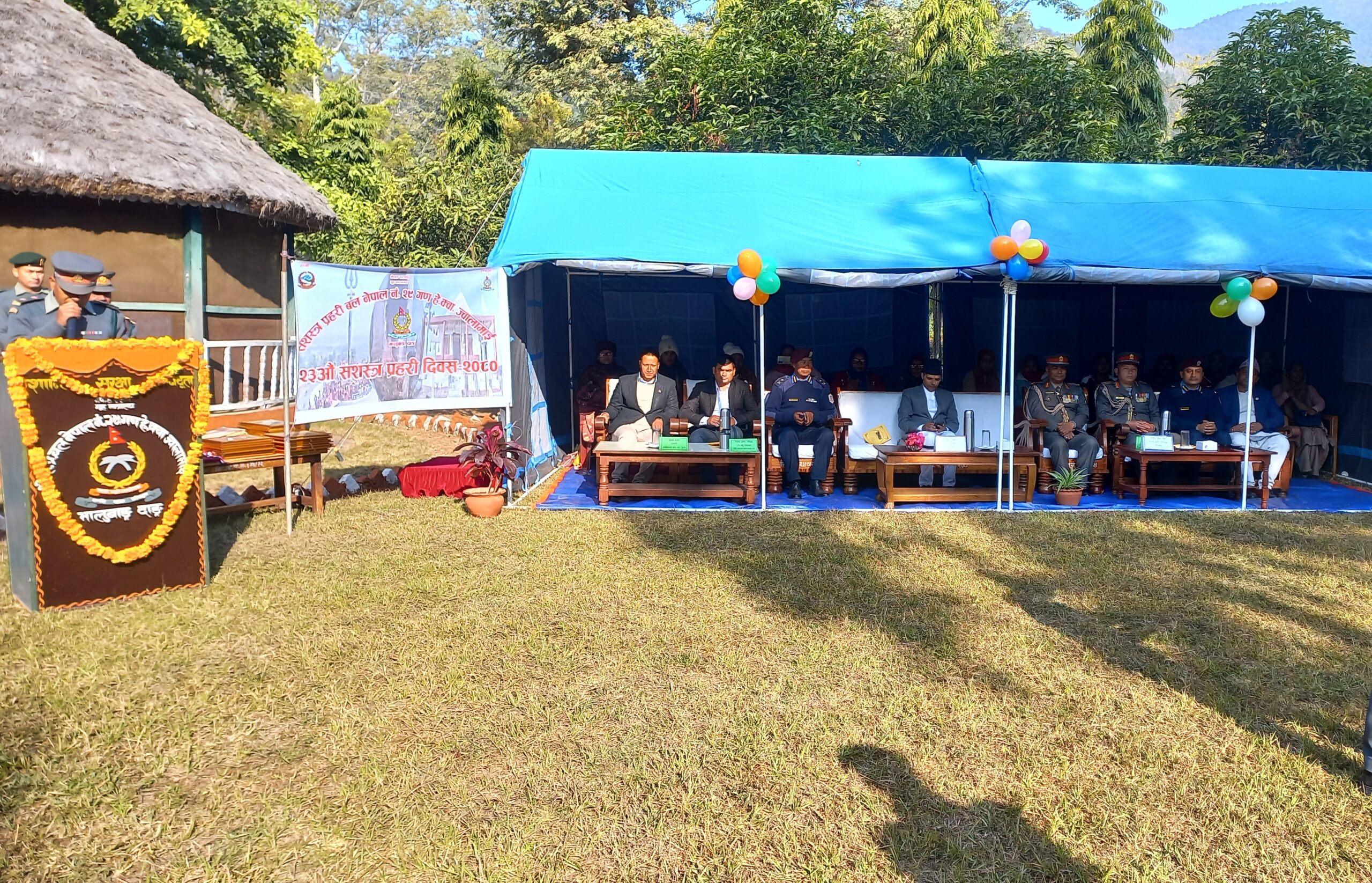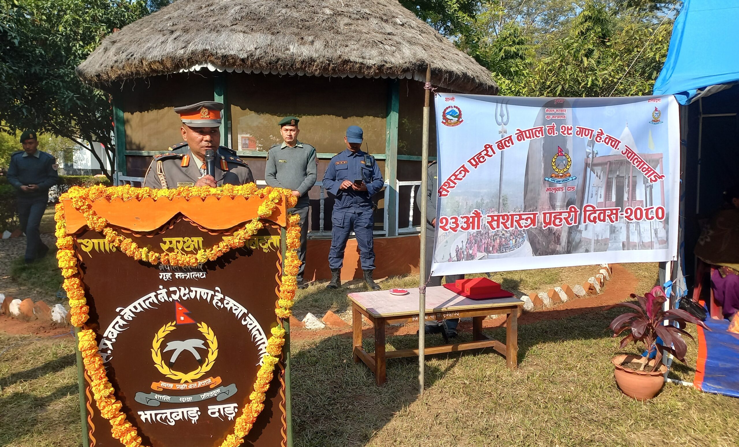 सशस्त्र प्रहरी बल नेपाल नं. २९ गण हेड क्वाटर ज्वालामाई भालुवाङका गणपती तथा सशस्त्र प्रहरी उपरिक्षक गोपाल प्रसाद श्रेष्ठको अध्यक्षता तथा दाङका प्रमुख जिल्ला अधिकारी रामबन्दु सुवेदीको प्रमुख आतिथ्यतामा सम्पन्न कार्यक्रममा बोल्दैे प्रमुख जिल्ला अधिकारी सुवेदीले सशस्त्र प्रहरीले सिमा सुरक्षा, विपद् व्यवस्थापन, तस्करी नियन्त्रण र राजश्व चुहावट नियन्त्रणमा खेलेको भूमिका प्रभावकारी रहेको बताउनु भयो । ‘आजको दिनले सशस्त्र प्रहरीलाई थप उचाउमा पुर्याएको छ ।’ सुवेदीले भन्नु भयो ‘सशस्त्र प्रहरी मुख्य जिम्मेवारीमा रहेर राष्ट्रसेवा प्रती तथा जिल्लाको प्रभावकारी काममा उत्कृष्ठ कार्य सम्पादन गरेको छ ।’