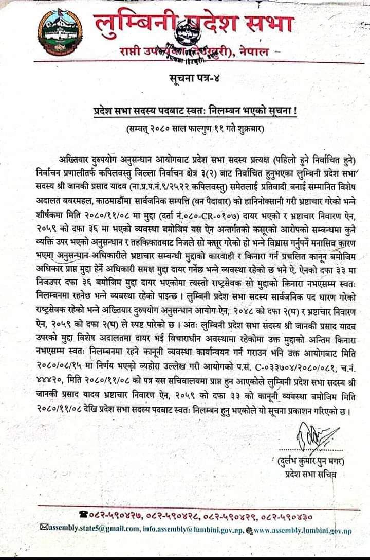 लुम्बिनी प्रदेश सभाले सूचना जारी गर्दै मुद्दाको अन्तिम किनारा नलाग्दासम्मका लागि यादवलाई निलम्बित गरिएको जानकारी दिएको छ।