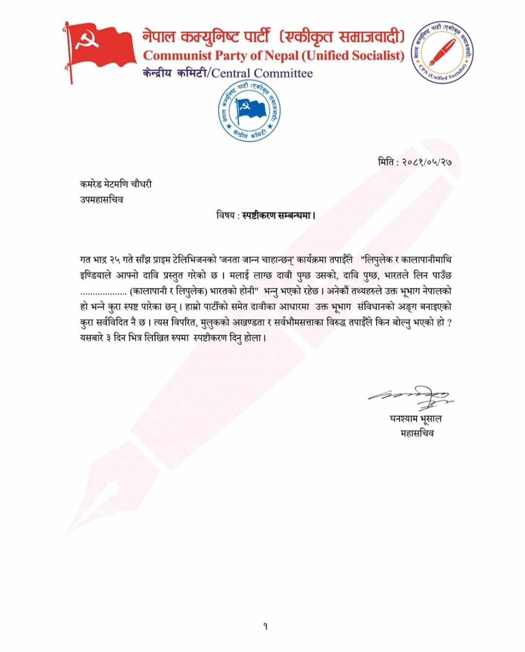 महासचिव घनश्याम भूसालले चौधरीसँग तीन दिनभित्र लिखित स्पष्टीकरण बुझाउन पत्र पठाएका छन् । प्रमुख सचेतक समेत रहेका चौधरीले टेलिभिजन अन्तर्वार्तामा नेपालको भौगोलिक अखण्डताबारे बोलेको थिए ।